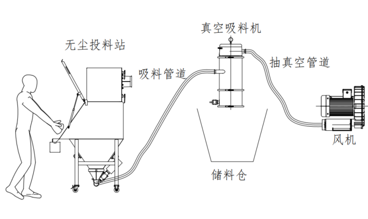 无尘投料站的工作原理是投料时产生的物料粉尘被离心风机或抽气管道形成的负压吸到过滤系统中,使物料与空气分离,防止粉尘四散逃逸、污染周围环境和保护操作者身体健康。